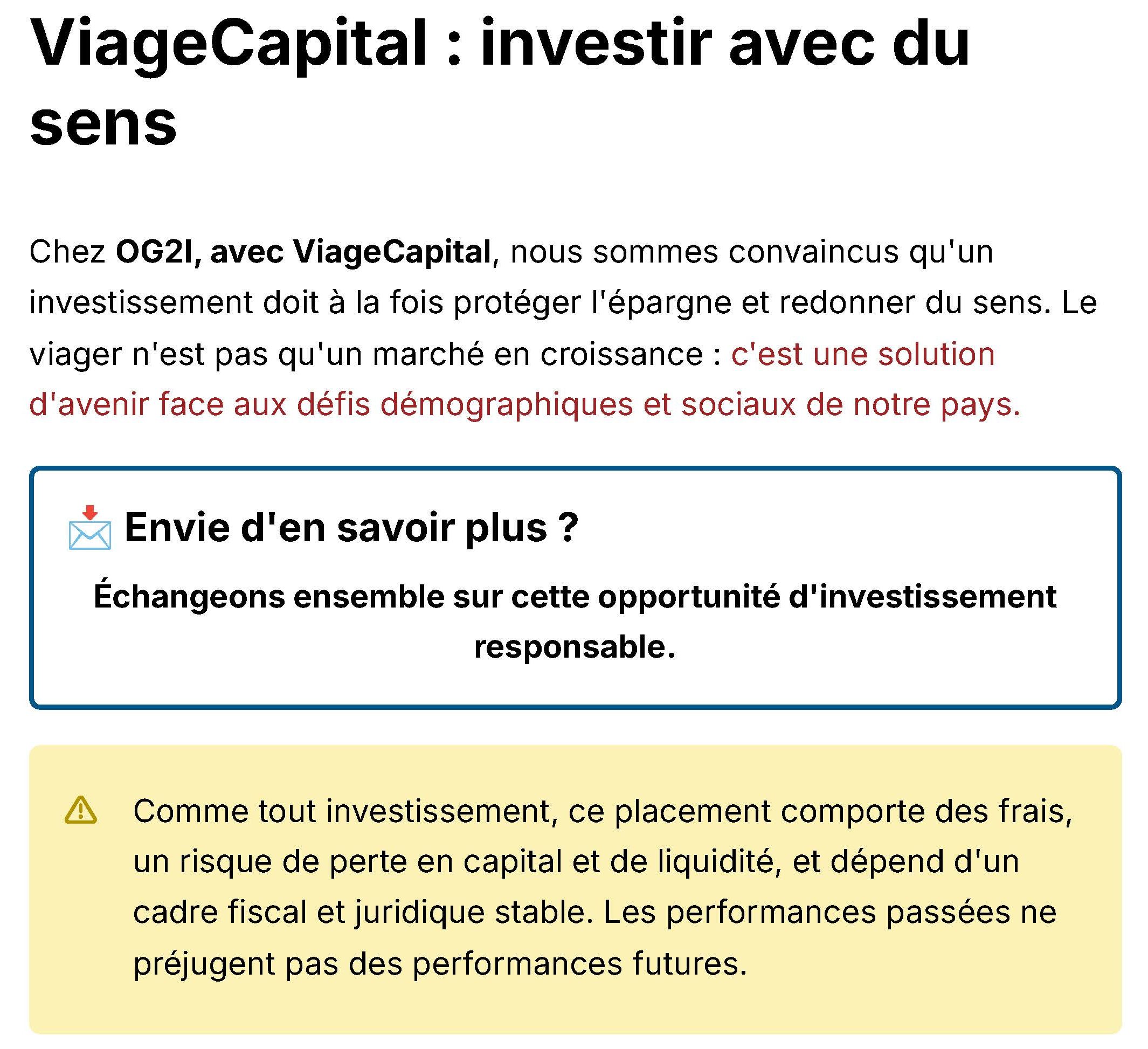 Chez OG2I, avec ViageCapital, nous sommes convaincus qu’un investissement doit à la fois protéger l’épargne et redonner du sens.